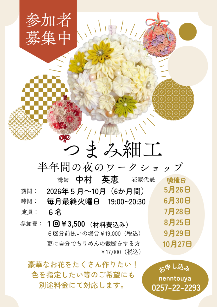 2026年5月~10月の期間つまみ細工 夜のワークショップ講座を開催今年はつまみ細工のボールブーケ作りですご興味のある方は、お問合せお待ちしています